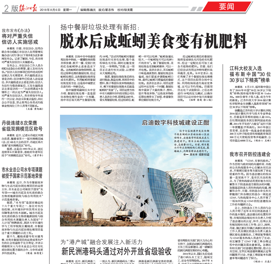 前不久,戴晓虎曾专程来镇考察,对我市餐厨项目的运营成果和产生的社会效益给予充分肯定,并表示将继续深人与市水业总公司在有机质协同处置方面的合作,力争形成更多科技成果。(樊迪 陆倩雯)