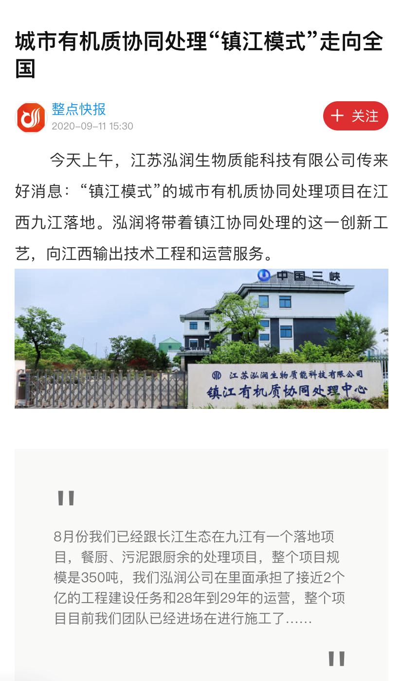 今天上午,江苏泓润生物质能科技有限公司传来好消息:“镇江模式”的城市有机质协同处理项目在江西九江落地。泓润将带着镇江协同处理的这一创新工艺,向江西输出技术工程和运营服务。
